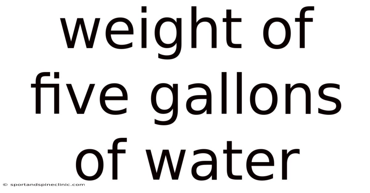Thus, under standard conditions, the weight of five gallons of water is roughly 18.9 kilograms or 41.7 pounds. This figure assumes the water is at room temperature (around 20 °C/68 °F) and that no other substances are mixed in.
